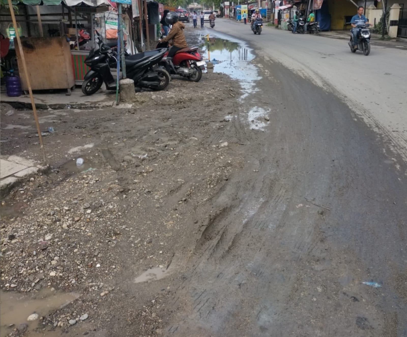 Dari amatan wartawan di lapangan kondisi galian drainase di Jalan Alfalah Raya tersebut terdapat genangan lumpur dan membuat aktifitas warga tergangu terutama para pedagang yang harus memakai triplek untuk menutupi genangan lumpur.